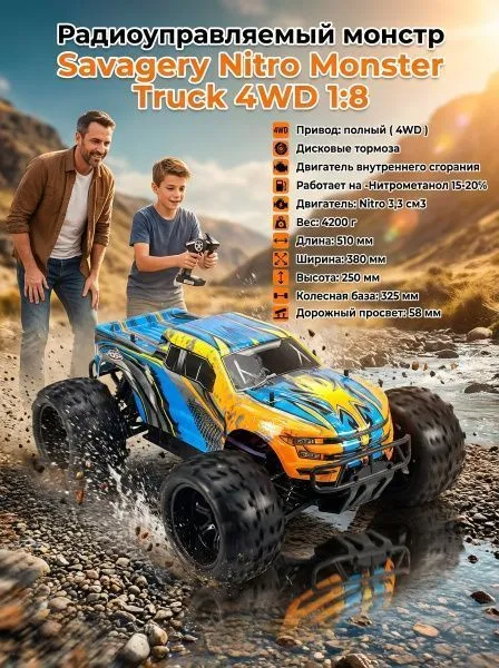 Радиоуправляемый монстр Savagery Nitro Monster Truck 4WD 1:8 - 94972-97291 - это полноуправляемая полноприводная модель внедорожника с ДВС 21 cpx. Дисковые тормоза.