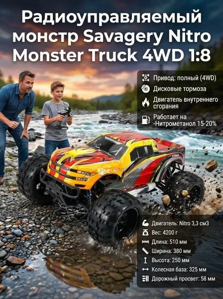 Радиоуправляемый монстр Savagery Nitro Monster Truck 4WD 1:8 - 94972-97292 - это полноуправляемая полноприводная модель внедорожника с ДВС 21 cpx. Дисковые тормоза.